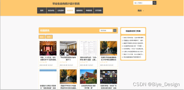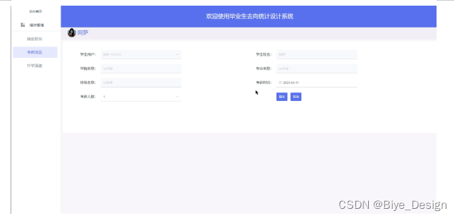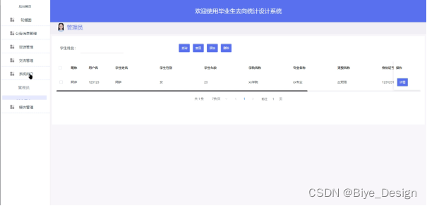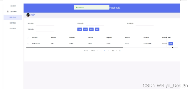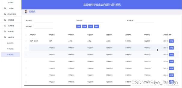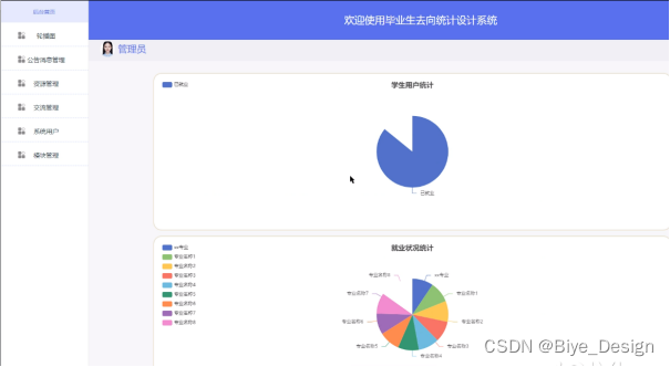 The main functional modules of the graduate destination statistical design system mainly include the implementation of two major modules: administrator and student user. The administrator functional modules include: homepage, rotation chart (rotation chart management), announcement message management (announcement message), resource management (campus information, information classification), communication management (alumni forum, forum classification), system user (administrator, student user) Module management (employment status, postgraduate entrance examination, further education), personal center; The student user function module includes: homepage, module management (employment status, postgraduate entrance examination, further education), and personal center. This article adopts an object-oriented development model for software development and hardware installation, which can effectively meet practical usage needs. It improves the corresponding software installation and program coding work, adopts MySQL as the main storage unit for backend data, and uses spring boot framework, JSP technology, and Ajax technology for business system coding and development, achieving all the functions of the system. This report first analyzes the background, role, and significance of the research, laying the foundation for the rationality of the research work. Analyze the various requirements and technical issues of the graduate destination statistical design system, prove the necessity and technical feasibility of the system, and then provide a basic introduction to the technical software and design ideas required for the design system. Finally, implement the graduate destination statistical design system and deploy and operate it.