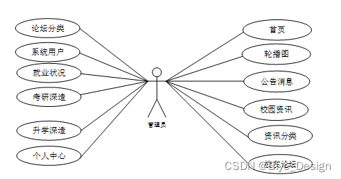 管理员功能需求:首页、轮播图(轮播图管理)、公告消息管理(公告消息)、资源管理(校园资讯、资讯分类)、交流管理(校友论坛、论坛分类)、系统用户(管理员、学生用户)、模块管理(就业状况、考研深造、升学深造)、个人中心等。