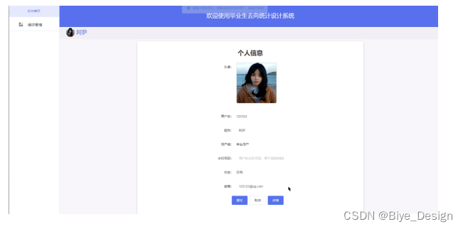 用户登录系统后台可查看用户个人管理功能:首页、模块管理(就业状况、考研深造、升学深造)、个人中心等,如图5-5