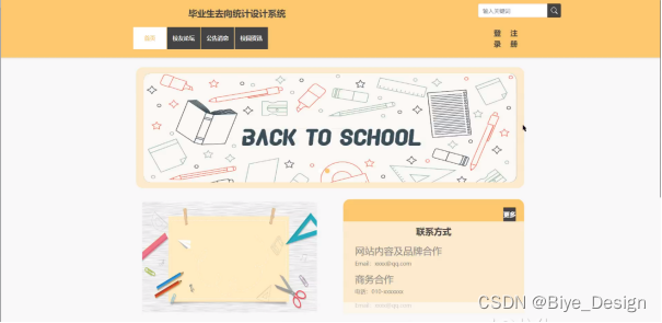 毕业生去向统计设计系统主要功能模块主要包括管理员和学生用户两大模块的实现,管理员功能模块包括:首页、轮播图(轮播图管理)、公告消息管理(公告消息)、资源管理(校园资讯、资讯分类)、交流管理(校友论坛、论坛分类)、系统用户(管理员、学生用户)、模块管理(就业状况、考研深造、升学深造)、个人中心;学生用户功能模块包括:首页、模块管理(就业状况、考研深造、升学深造)、个人中心。本文采取面对对象的开发模式进行软件的开发和硬体的架设,能很好的满足实际使用的需求,完善了对应的软体架设以及程序编码的工作,采取MySQL作为后台数据的主要存储单元,采用 springboot框架、JSP技术、Ajax技术进行业务系统的编码及其开发,实现了系统的全部功能。本次报告,首先分析了研究的背景、作用、意义,为研究工作的合理性打下了基础。针对毕业生去向统计设计系统的各项需求以及技术问题进行分析,证明了系统的必要性和技术可行性,然后对设计系统需要使用的技术软件以及设计思想做了基本的介绍,最后来实现毕业生去向统计设计系统和部署运行使用它。