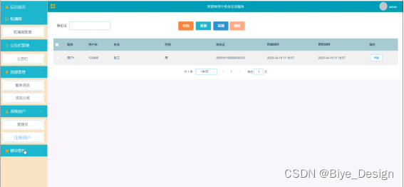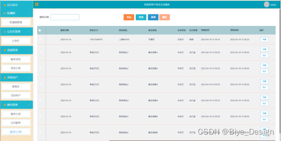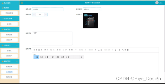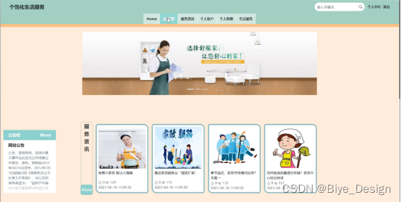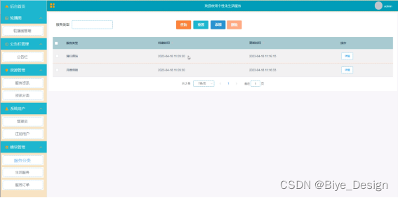 (1)功能要求:可以管理后台首页、轮播图(轮播图管理)、公告栏管理(公告栏)、资源管理(服务资讯、资讯分类)、系统用户(管理员、注册用户)、模块管理(服务分类、生活服务、服务订单)、个人中心等功能模块。