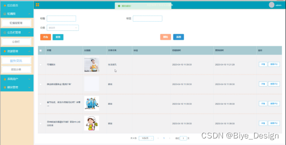 3、功能的完善性:可以管理后台首页、轮播图(轮播图管理)、公告栏管理(公告栏)、资源管理(服务资讯、资讯分类)、系统用户(管理员、注册用户)、模块管理(服务分类、生活服务、服务订单)、个人中心模块的修改维护操作。
