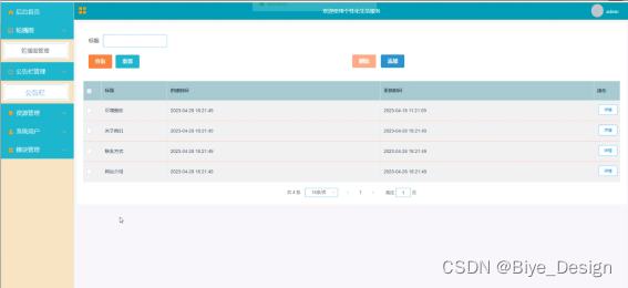公告栏管理,在公告栏管理页面中可以对索引、标题等信息进行详情、查询、删除等详细操作,如图5-10所示。