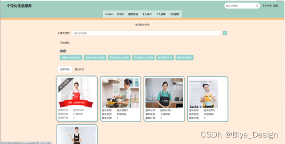 生活服务,在生活服务页面可以查看关键字搜索、排序、月嫂保姆、清扫保洁、服务名称、服务类型、服务价格等详细进行提交,如图5-2所示。