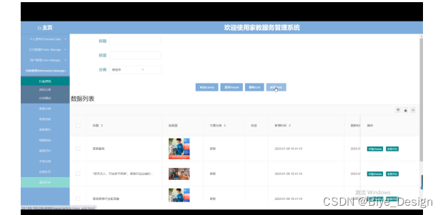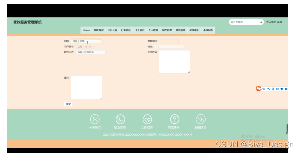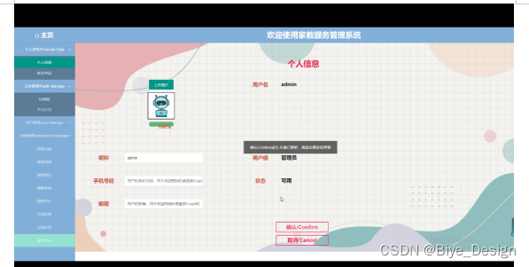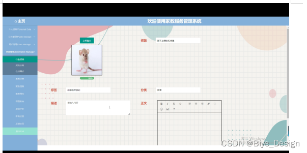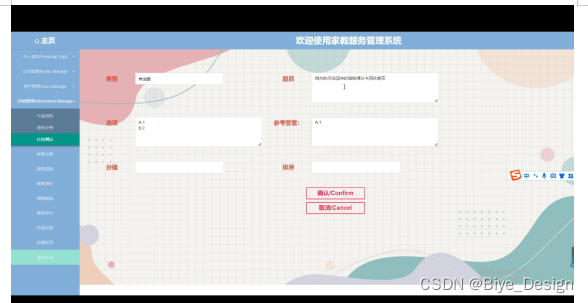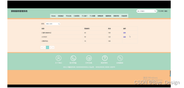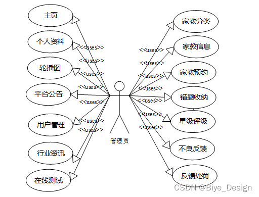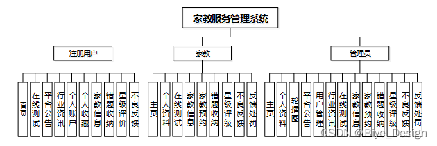 (1)功能要求:主页,个人资料,公告管理(轮播图,平台公告),用户管理(管理员,注册用户,家教),信息管理(行业资讯,资讯分类,在线测试),家教分类,家教信息,家教预约,错题收纳,星级评级,不良反馈,反馈处罚等功能模块。