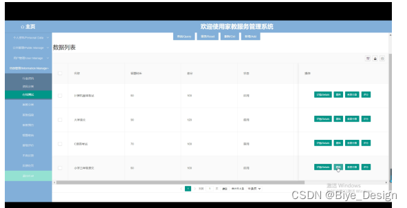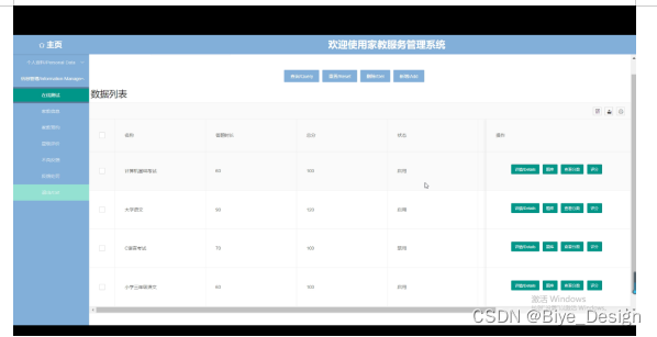 在线测试,在此界面可维护管理在线测试考卷,还可在此页面对进行重置,删除,添加,设计题库,评分等操作,如下图所示: