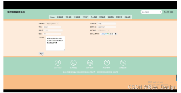 家教用户登录家教服务管理系统,功能为:主页,个人资料,信息管理(在线测试),家教信息,家教预约,错题收纳,星级评级,不良反馈,反馈处罚等功能,如下图所示:
