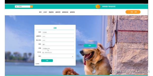 用户注册,通过填写账号、密码、昵称、邮箱等信息,输入完成后选择登录即可进入宠物医疗救助系统,如下图所示。