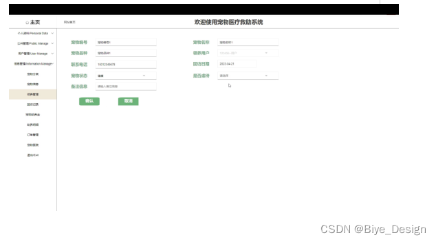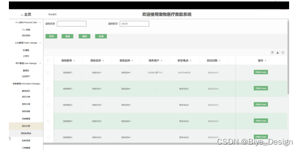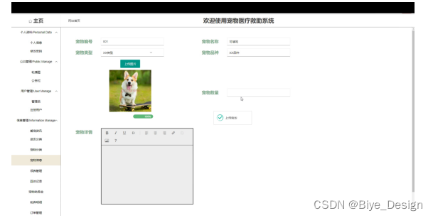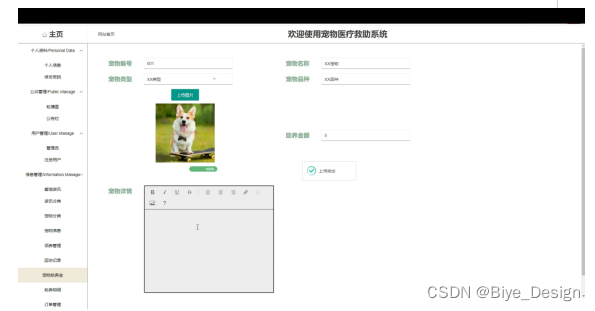 With the continuous development of the domestic economy, the improvement of people's income level, and the increasing demand for emotions, pet keeping has become a popular trend. In order to facilitate the management of pets, reduce the number of stray pets, enhance people's love for animals, and meet people's pet needs. This article introduces a pet medical assistance system. The system adopts a B/S structure, utilizing features such as efficiency, convenience, and low cost, to provide a public welfare adoption platform for pet enthusiasts. The database used in this system is MySQL, developed using Java as the development language and based on the SSM framework. During the design process, the system code was fully guaranteed to have good readability, practicality, scalability, universality, ease of later maintenance, easy operation, and concise pages.