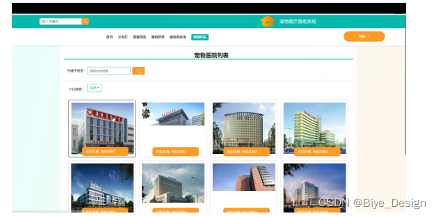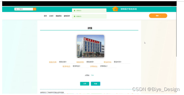 宠物医院,在此界面可以查看和搜索宠物医院信息,可以进行收藏,点赞,地址查看等操作,如下图所示。