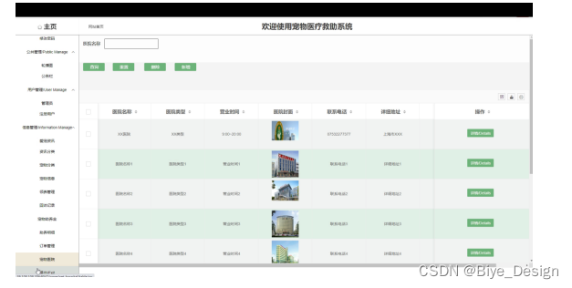 宠物医院管理,管理员在此页面可以维护宠物医院信息,进行查询,重置,删除,新增等操作,如下图所示。