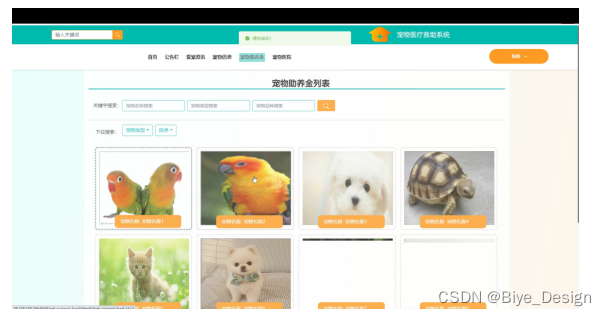 宠物助养金,在此界面可以查看和搜索可助养的宠物信息,可以进行收藏,点赞,助养等操作,如下图所示。