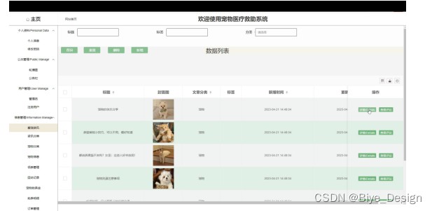 爱宠资讯管理,管理员在此页面可以查看资讯标题,封面图,分类,新增时间,更新时间等信息,并可根据需要进行查询,重置,删除,新增等操作,如图5-4所示。