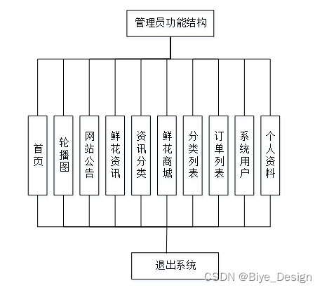 管理员功能模块包括:主页、个人资料(个人信息、修改密码)公共管理(轮播图、网站公告)、信息管理(鲜花资讯、资讯分类)、鲜花商城、分类列表、订单列表、用户管理(管理员、注册用户)等模块。