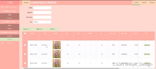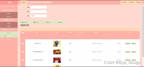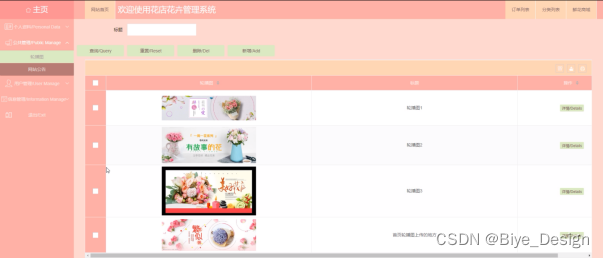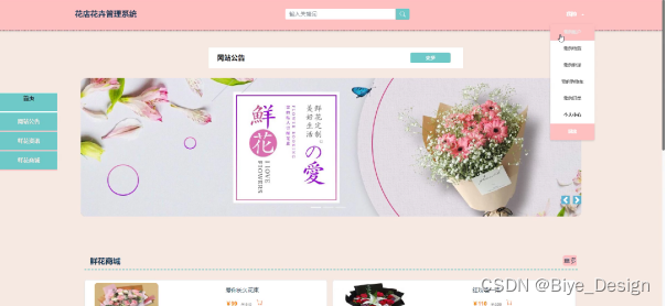 本系统设计的是一个花店花卉管理系统的网站,此网站使用户实现了不需出门就可以在鲜花前进行网上查看主页、个人资料(个人信息、修改密码)公共管理(轮播图、网站公告)、信息管理(鲜花资讯、资讯分类)、鲜花商城、分类列表、订单列表、用户管理(管理员、注册用户)等功能。不需亲临现场就可以在网站查看商城信息和鲜花资讯。
