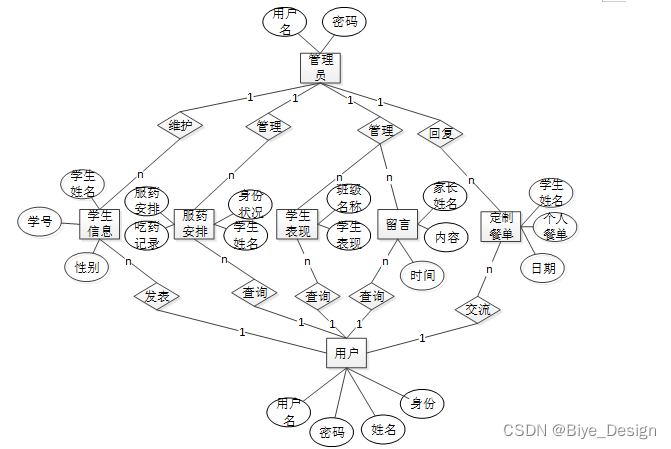 概念设计包括实体和联系两部分,如该系统中,用户是一个实体,其属性包括用户 ID 标识、用户名、密码、电话、身份等属性。联系是指实体之间有意义的关联,包括一对一、一对多、多对多三种类型。