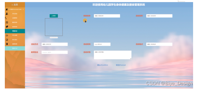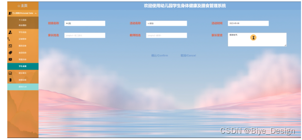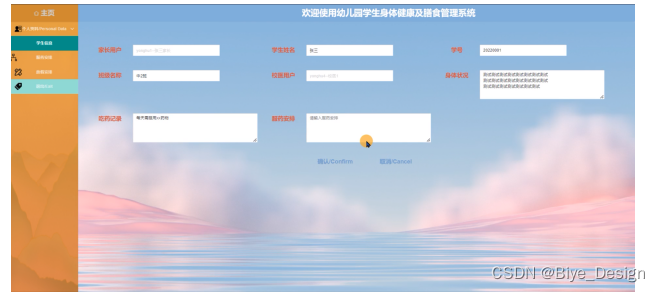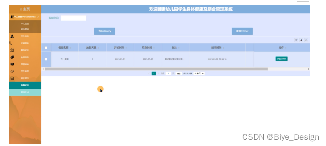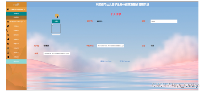 幼儿园学生身体健康及膳食管理系统的后台中,管理员对用户在前台提交申请产生的数据进行处理,以满足用户的需求。前台系统和后台系统有数据交互,整个系统各个部分相互独立又密不可分。后台的功能主要包括后台:主页、个人资料、用户管理、学生信息、定制餐单、服药安排、食品信息、班级活动、学生表现、家长留言、放假安排等功能模块。