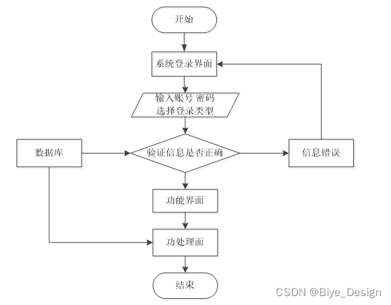 用户想进入系统,首先进入系统登录界面,通过正确的用户名、密码,选择登录类型登录,系统会检查登录信息,信息正确,然后输入相应的功能界面,提示信息错误,登录失败。系统操作流程如图3-4所示。