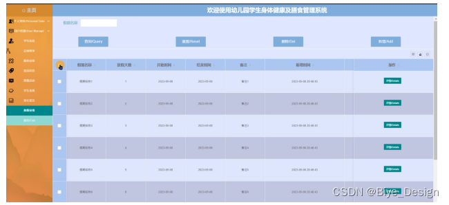 幼儿园学生身体健康及膳食管理系统中的管理人员在“放假安排”这一菜单下是可以对放假安排信息进行添加、重置、查询或删除等操作,其管理界面如下图5-15所示。