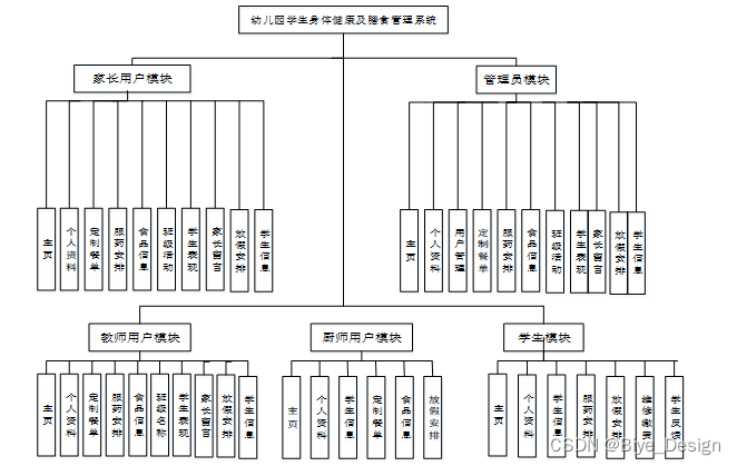 (3)确定好系统使用的技术,进行在线确认系统所划分的用户角色,并且根据用户角色划分确定所要设计的功能模块,对于幼儿园学生身体健康及膳食管理系统的设计主要划分别为管理员、家长用户、教师用户、厨师用户和校医用户角色,并所使用的功能模块也相应不同,但是系统的数据库实现的内容是交互的,用户可以随时根据自己的需求进行信息搜索,对于系统工作人员可以根据自己的分管内容进行在线信息的处理及操作,管理员获取到所有用户的详细数据信息,并根据需求进行第一时间处理解决。