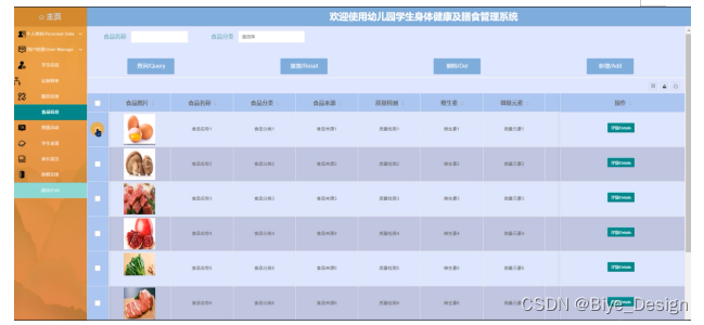 幼儿园学生身体健康及膳食管理系统中的管理人员在“食品信息”这一菜单中是可以对幼儿园学生身体健康及膳食管理系统内的食品信息进行添加、重置、查询或删除等操作,界面如下图5-14所示。