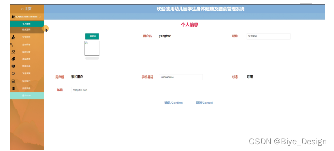 幼儿园学生身体健康及膳食管理系统中的管理人员在“个人资料”这一菜单中是可以对个人信息和密码进行修改等操作。界面如下图5-12所示。