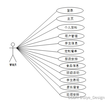 管理员所能使用的功能主要有:主页、个人资料(个人信息、修改密码)、用户管理(管理员、家长用户、教师用户、厨师用户、校医用户)、学生信息、定制餐单、服药安排、食品信息、班级活动、学生表现、家长留言、放假安排等功能模块。