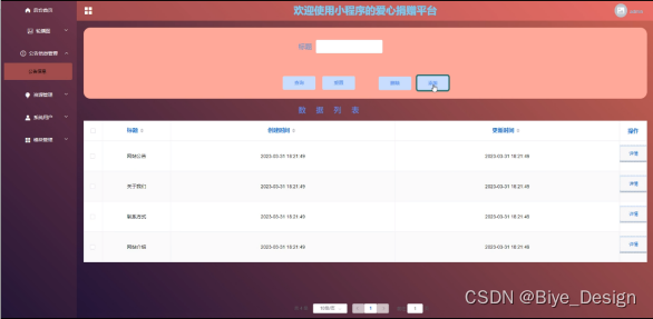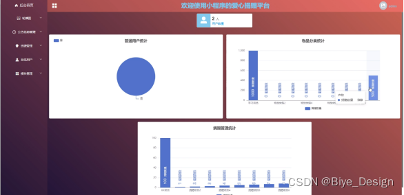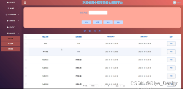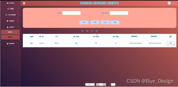 With the rapid development of our country's economy, people's demand for mobile phones is increasing, and various mobile software is also widely used. However, for data information management of mobile phones, various software for mobile phones are also highly favored by users. The love donation platform for mini programs is widely used by users, and users can easily manage the data information of the love donation platform for mini programs at any time, We have developed a love donation platform for the SSM mini program.