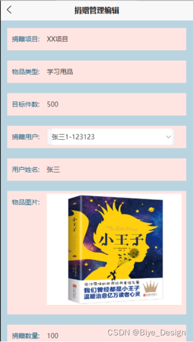 捐赠管理,在捐赠管理页面可以查看捐赠项目、物品类型、目标件数、捐赠用户、用户姓名、物品图片、捐赠数量等信息,如图5-7所示。