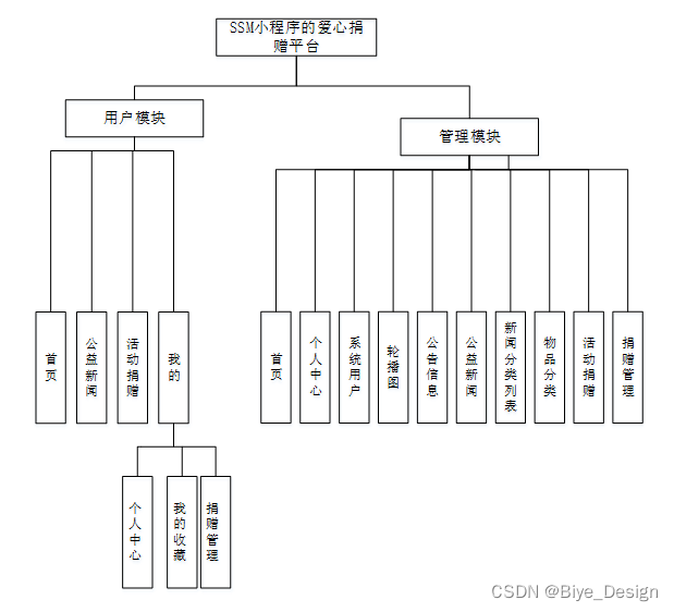 这些功能可以充分满足 小程序的爱心捐赠平台的需求。此系统功能较为全面如下图系统功能结构如图4-5所示。