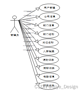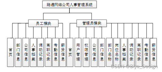 系统设计的目的是分析系统包括的所有功能结构,为开发人员设计开发和实现系统做好准备工作。经过前期的需求调查、分析和整理之后,确定的总体需求主要包括多个模块,分别是:首页、系统用户(管理员、普通用户)权限管理(权限列表)模块管理(公司信息、部门信息、部门名称、岗位名称、人事档案、调动记录、离职记录、考勤信息、薪资信息)。系统整体角色分为二个部分,一是员工、二是管理员。权限分布也是很明显,员工是在除去浏览信息之外还具有查询和管理自己账户信息、首页、公司信息、部门信息、人事档案、调动记录、离职记录、考勤信息、薪资信息等权限;管理员是最高权限拥有者。