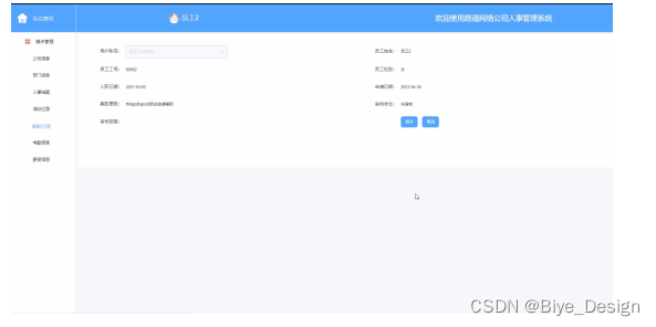 管理员点击离职管理菜单,点击离职添加子菜单,添加离职数据,填写离职信息成功后,离职数据页面刷新,新数据成功载入页面。