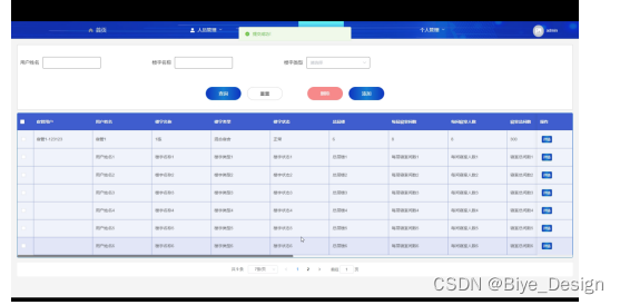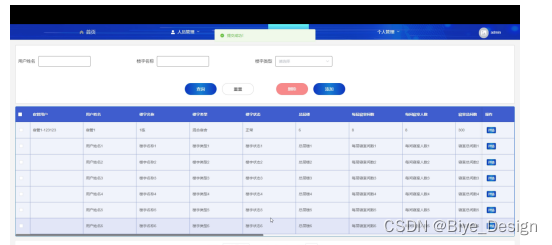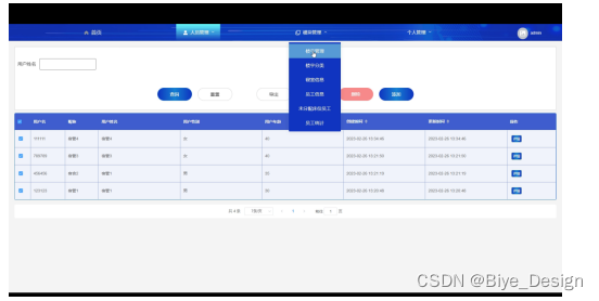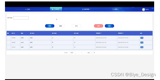 人员管理,在此页面可以查看用户名,昵称,性别,年龄等信息,并可根据需要对个人信息进行查询,重置,导出,删除,添加等操作,如下图所示。