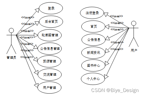 用户模块:个人资料管理、交流论坛、新闻资讯、图书中心、借阅申请、图书归还等。