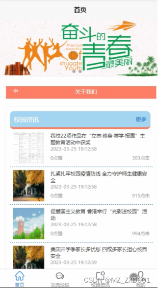 用户首页页面可以查看首页、交流论坛、校园资讯、我的(个人中心、收藏)等信息,进行提交操作,如图5-3所示。