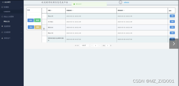 管理员进入网站公告管理界面,通过界面的任务大厅,登录成功后进入到系统可以进行查看网站公告等信息,进行增删改查等操作,如图5-10所示。