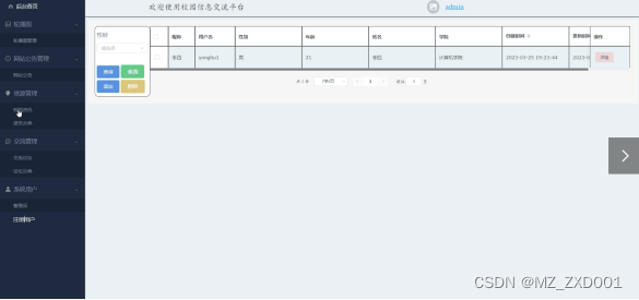 管理员进入到界面,通过界面的任务大厅,登录成功后进入到系统可以进行查看首页、轮播图、网站公告、资源管理(校园资讯、资讯分类)交流管理(交流论坛、论坛分类)系统用户(管理员、注册用户)、系统管理等功能模块,进行相对应操作,如图5-9所示。