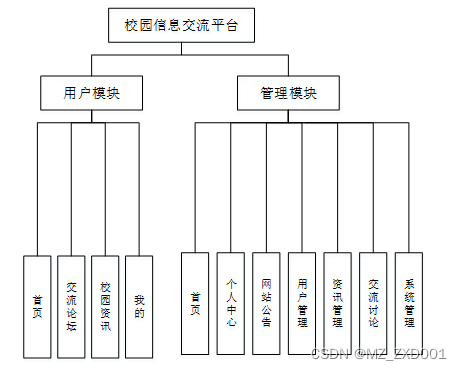 基于校园信息交流平台的设计基于现有的手机,可以实现首页、轮播图、网站公告、资源管理(校园资讯、资讯分类)交流管理(交流论坛、论坛分类)系统用户(管理员、注册用户)等详细的了解及统计分析。根据系统功能需求建立的模块关系图如下图: