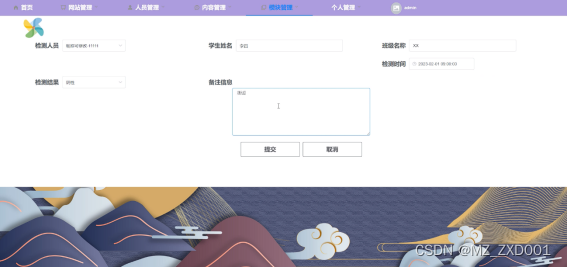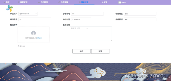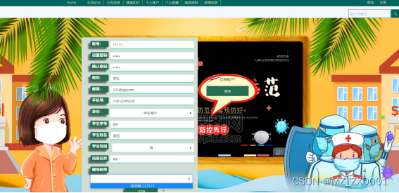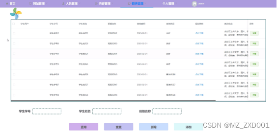 3、功能的完善性:拥有首页,体检报告统计,疫情信息统计,网站管理(轮播图,公告信息),人员管理(管理员,教师用户,学生用户),内容管理(交流论坛,论坛分类,健康知识,知识分类),模块管理(健康打卡,疫苗接种,接种预约,核酸检测,药物管理,体检报告,班级管理,学院管理,请假申请,体测管理,疫情信息),个人管理等模块的修改维护操作。