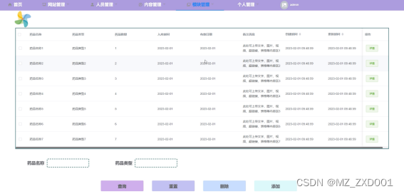 药物管理:可以查看库存药物情况,包括药品名称,类型,数量,入库时间,有效时间等信息。可以进行查询、重置、删除、添加等操作,如图5-9,5-10所示。