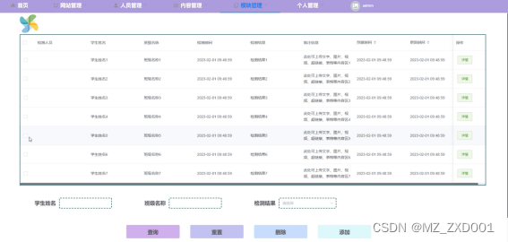 核酸检测:可以查看核酸检测情况,包括检测人员,学生姓名,班级,检测时间等信息。可以进行查询、重置、删除、添加等操作,如图5-7,5-8所示。