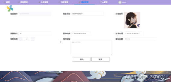 疫苗接种:可以查看疫苗接种信息的标题,封面图,位置,时间等详细描述等信息。可以进行查询、重置、删除、添加等操作,如图5-5所示。