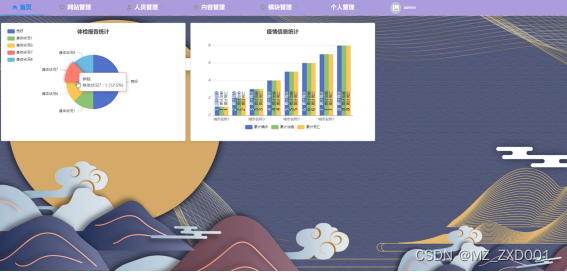 (1)功能要求:首页,体检报告统计,疫情信息统计,网站管理(轮播图,公告信息),人员管理(管理员,教师用户,学生用户),内容管理(交流论坛,论坛分类,健康知识,知识分类),模块管理(健康打卡,疫苗接种,接种预约,核酸检测,药物管理,体检报告,班级管理,学院管理,请假申请,体测管理,疫情信息),个人管理等功能模块。