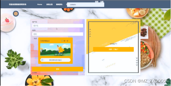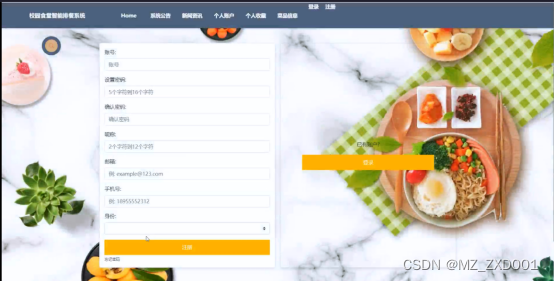 (1)注册登录模块:当用餐用户想要进入本校园食堂智能排餐系统中对资讯进行查看评论以及了解菜品信息等操作的时候,就必须要登录到系统当中,要是新的用户没有校园食堂智能排餐系统的账号的话,点击“注册”按钮,就会进入到新用户注册这个界面上,用户输入对应的账号(必须填写)+密码(必须填写)+确认密码(必须填写,而且要与密码一直)+昵称+邮箱+手机号+选择用户身份等等,然后点击“注册”,系统在用户这一数据库中会查询账号是不是存在,两次密码是不是一样,都填写正确就会注册成功,然后再进行登录,如果是之前已经注册过的用户很长时间没有使用,忘记密码,也可以点击“忘记密码”进行找回;