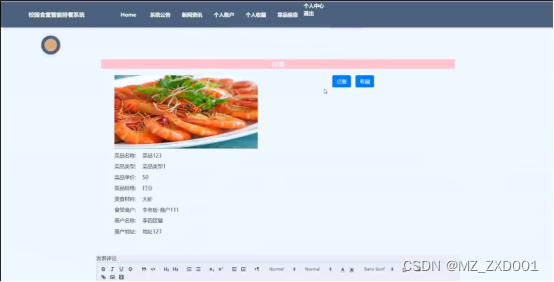 (6)菜品信息:学生可以查看菜品信息,在查询到自己想要了解的菜品的时候,可以进入查看详细的介绍,点击“点餐”这一按钮以后会跳转到点餐信息填写的界面,根据提示填写好点餐的信息,点击“提交”以后点餐就完成了,在菜品详情这个界面,同时支持用户对喜欢的菜品进行收藏、评论的功能。