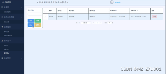 (3)系统用户:当点击“系统用户”这一菜单的时候,会出现管理员+用餐用户+食堂商户三个子菜单,可以对这三个模块进行增删改查操作;