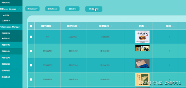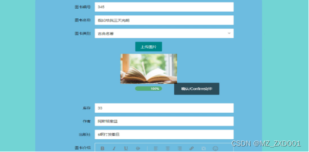 管理员在图书信息列表发布图书,跳转至图书新增表单,提交图书信息,包括图书编号、图书名称、图书类别、作者、库存,新增时间,更新时间、图书封面等,图书提交后,数据库的图书信息表刷新数据,系统将图书信息展示出来。