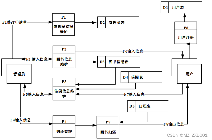管理员拥有最高权限,在对各项信息进行增加、删除、修改后会更新后台数据库的内容,用户在登录进行浏览图书资讯、个人收藏、个人账户、图书信息查询、图书借阅,归还操作等指令动作同样会更新后台数据。