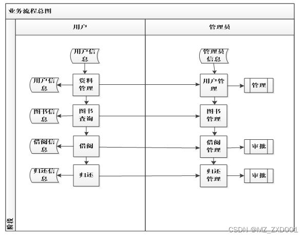 普通用户在系统前台后,数据库的借阅记录表生成借阅记录信息,管理员在图书借阅列表审核用户的借阅信息,审核通过,用户借阅成功,否则借阅失败。