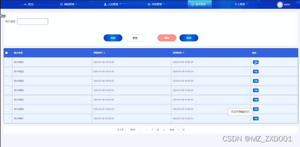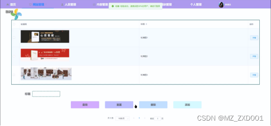 (2)网站管理:当点击“网站管理”这一菜单的时候,会出现公告消息+轮播图这两个子菜单,可以对这两个模块进行增删改查操作;